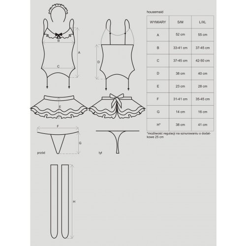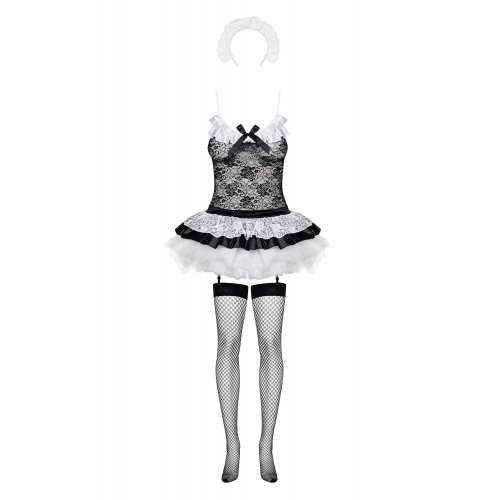 В комплект входят: корсет, юбка, стринги, чулки, ободок на голову.