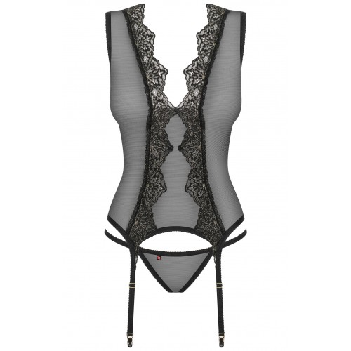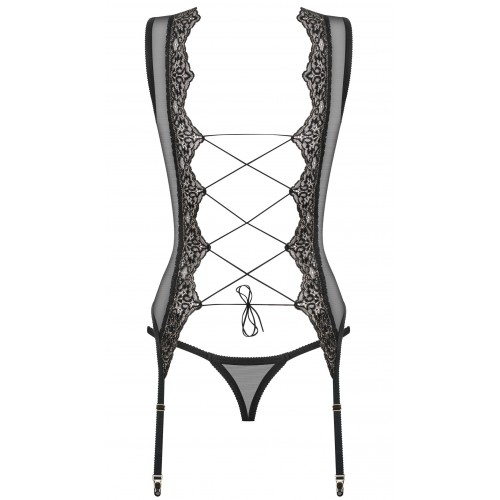 Детали: прозрачный материал - решение, идеально подчеркивающее фигуру, интригующая корсетная привязка на спине, регулируемые ремни для чулок, сексуальные стринги в комплекте