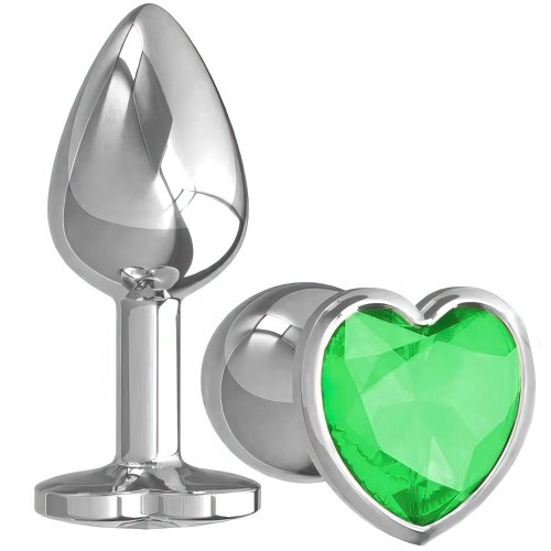 Металлическая анальная пробка с зеленым камушком в виде сердечка M