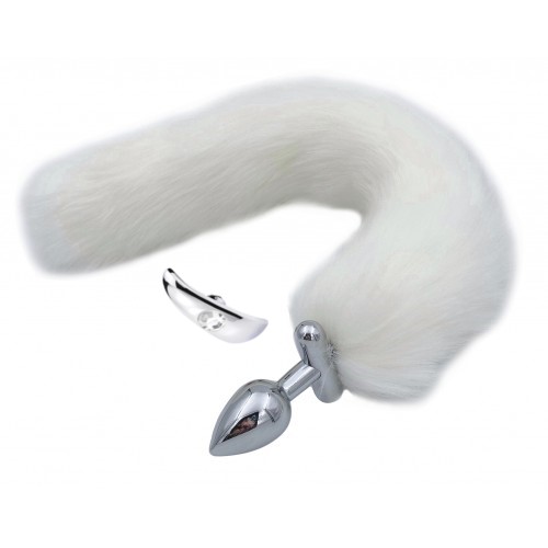 Металлическая анальная втулка со съемным белым хвостиком и пробкой с прозрачным кристаллом