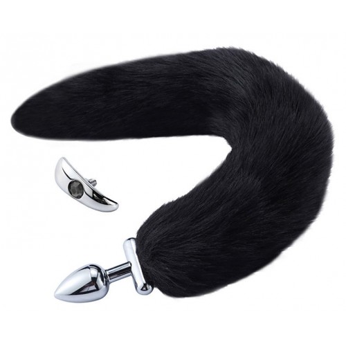 Металлическая анальная втулка со съемным черным хвостиком и пробкой с черным кристаллом