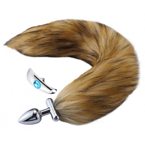 Металлическая анальная втулка со съемным рыжим хвостиком и пробкой с голубым кристаллом