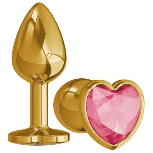 Золотистая анальная пробка с розовым камушком в виде сердечка L
