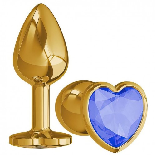 Золотистая анальная пробка с синим камушком в виде сердечка S