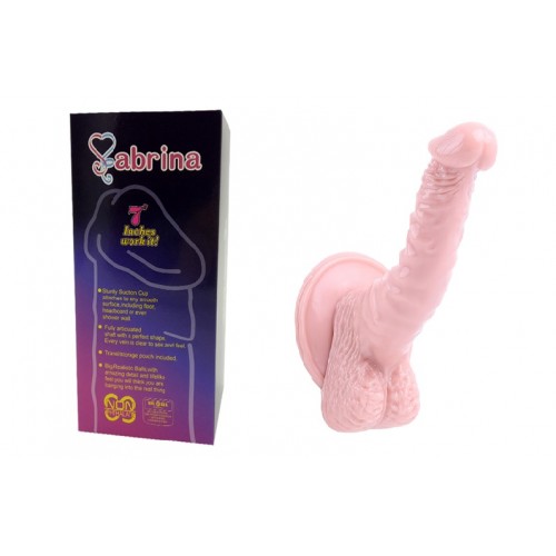 Реалистичный фаллоимитатор изогнутой формы с мошонкой и ярко выраженной головкой.