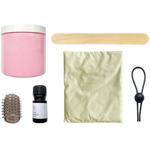 В набор входят: 1 упаковка 3D-гипса, баночка с силиконом, пузырек с затвердителем, эрекционное лассо, деревянная палочка, перчатки, насадка для колбы и инструкция.