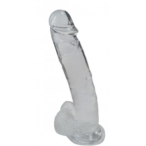 Реалистичный прозрачный фаллоимитатор с мошонкой и ярко выраженной головкой.