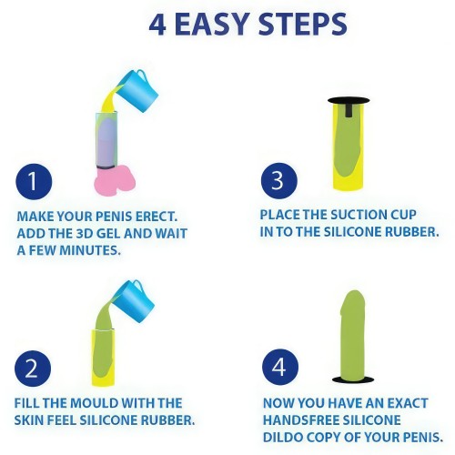 Комплект включает: 1 форма для литья (внешняя упаковка набора) + присоска; 1 петля для пениса; 1 манжета; 1 флакон с отвердителем; 1 упаковка геля 3D; 1 банка силиконовой резины; 1 пара пластиковых перчаток; 1 деревянный шпатель; 1 пошаговая инструкция