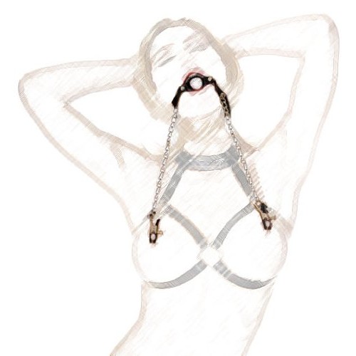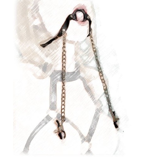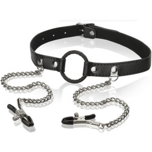 Чёрный кляп-кольцо с зажимами для сосков на металлических цепочках послужит прекрасным дополнением для ролевых игр и БДСМ практик.