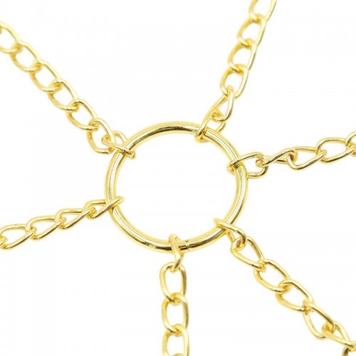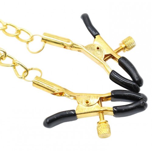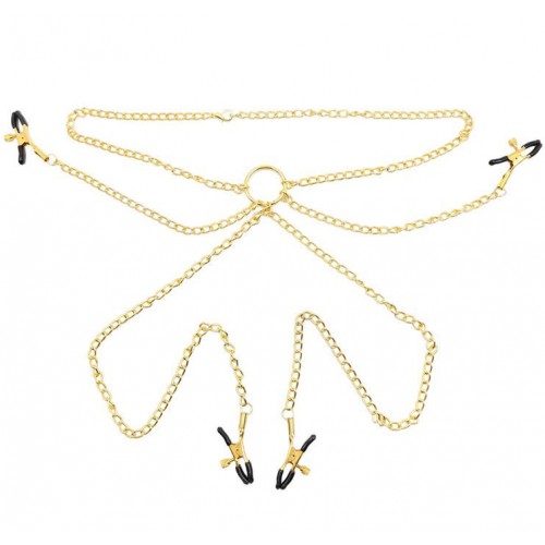 Золотистые зажимы на соски и половые губы с цепью на шею