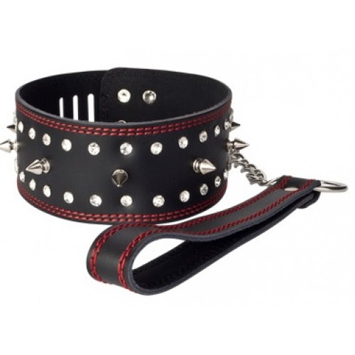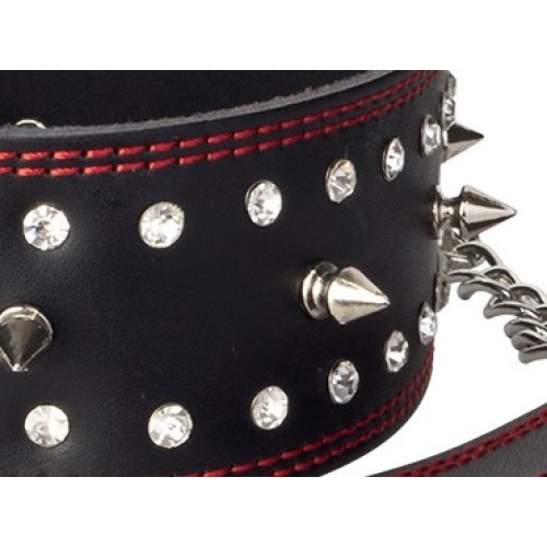 Кожаный БДСМ ошейник с шипами декорированный красной нитью и стразами регулируется по объему при помощи крепления с замочком, расположенного сзади, так же имеется поводок цепочка с темляком для большего удобства.