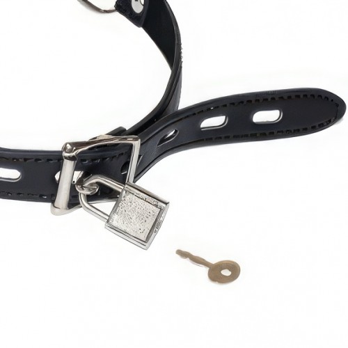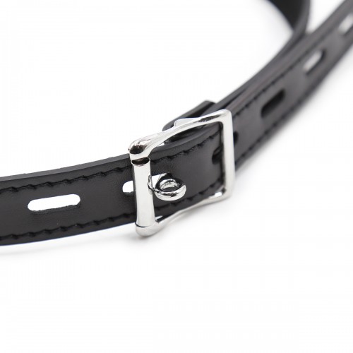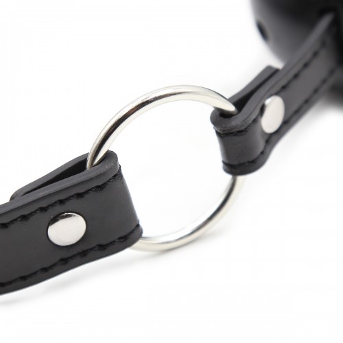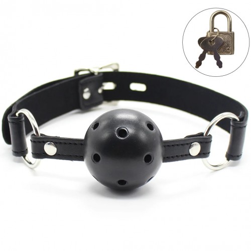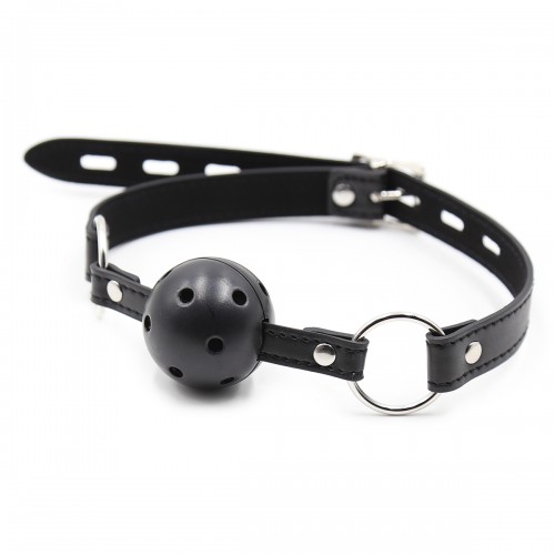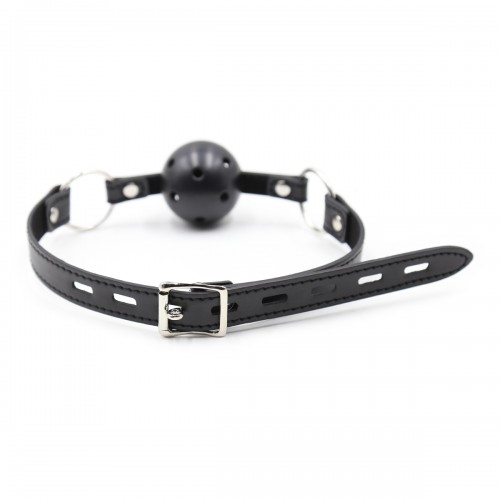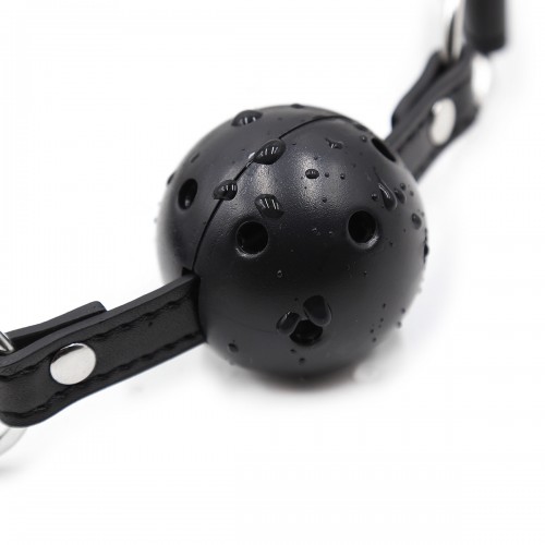 Кляп надежно фиксируется во рту, делая акцент на подчинение партнера, выполнен в виде пластикового шарика черного цвета с отверстиями.