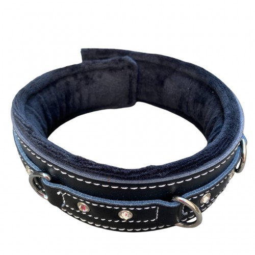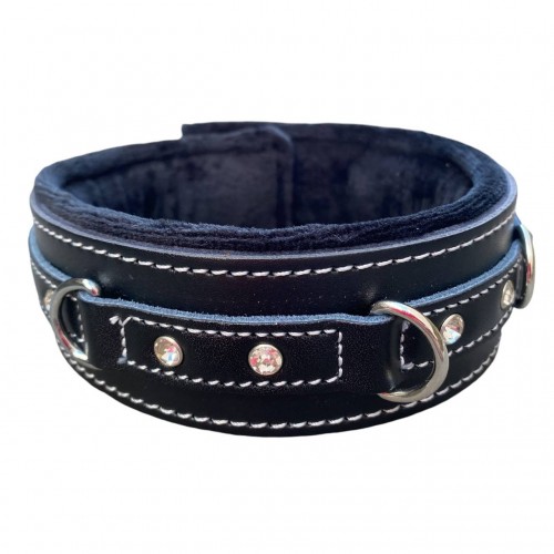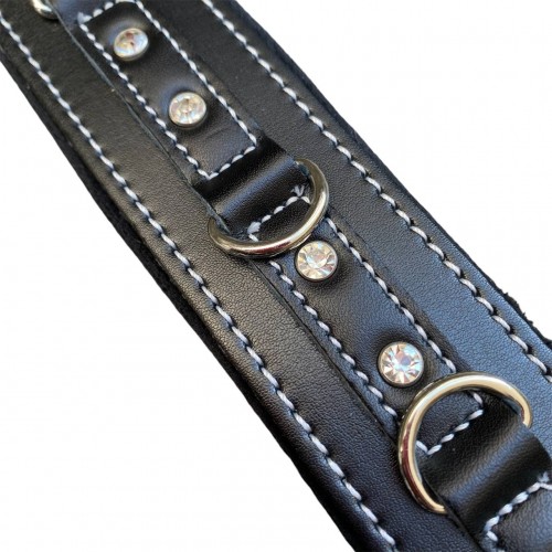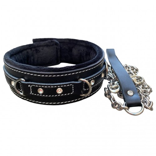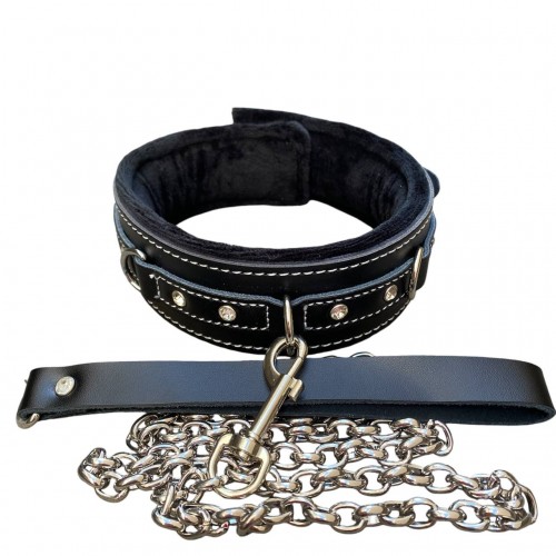 Кожаный черный ошейник со стразами и поводком