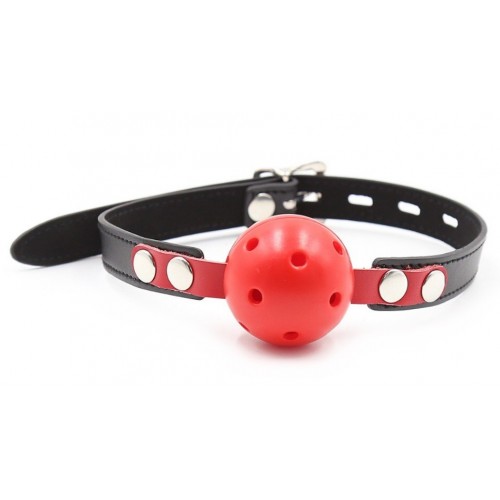 Дышащий кляп-шар красного цвета на черно-красном ремне