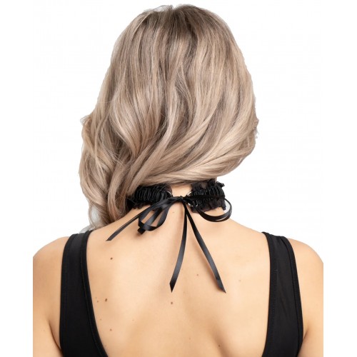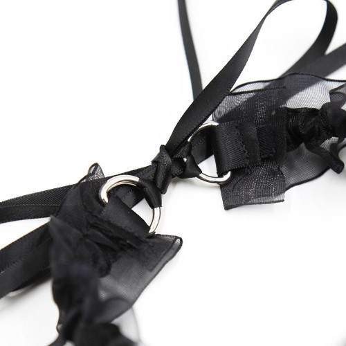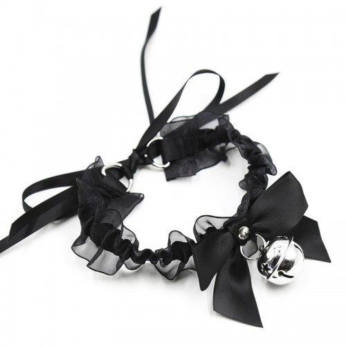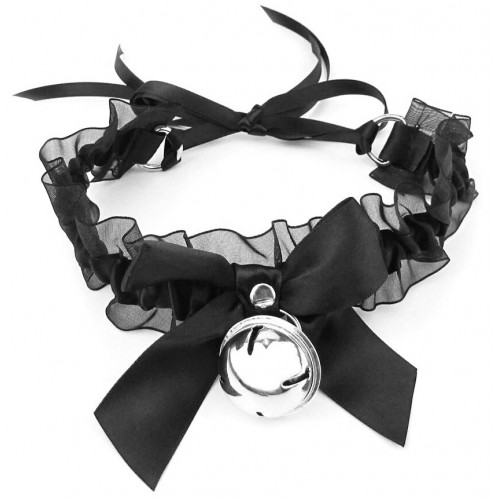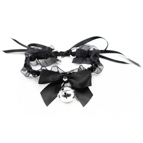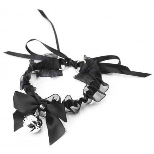 Эротический чокер с черными атласными лентами и бубенчиком