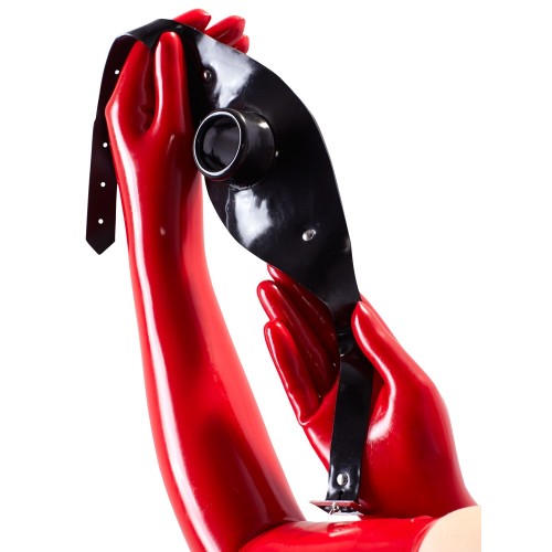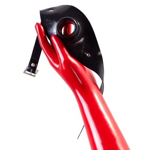 Маска с кляпом черного цвета с коротким фиксированным куском трубки позволяет любой жидкости беспрепятственно попадать в рот.