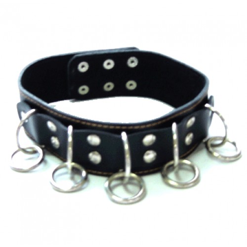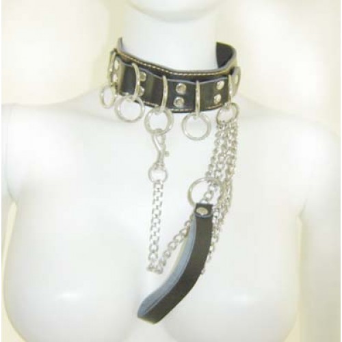Бондажный ошейник выполнен из чёрной кожи на металлическом поводке-цепочке с кожанным темляком. Декорирован металлическими клёпками и 5 стальными кольцами, пикрепленных к D-образным кольцам, что позволяет пристегнуть поводок, наручники, поножи или любой другой фиксатор.