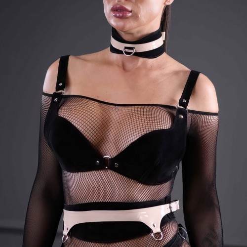 Ошейник выполнен из качественной натуральной замши и лаковой кожи. Необычная форма ошейника эффектно подчеркнет шею и дополнит образ.
