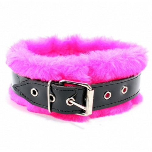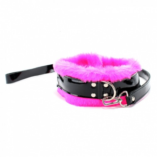 Ошейник из лакированной кожи с ярко-розовым мехом и поводком