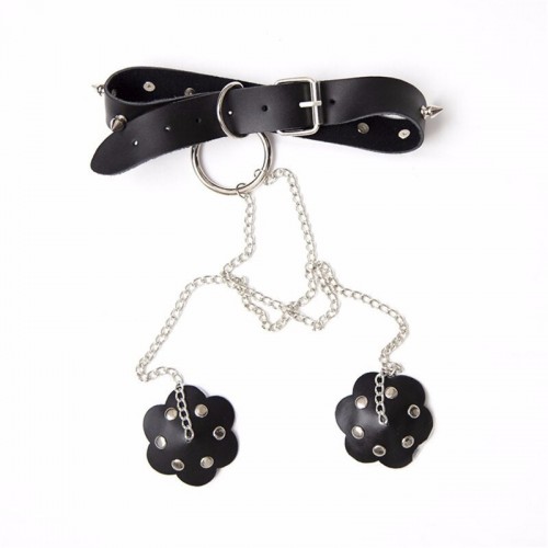 Размеры: ширина ошейника 2,5 см, по обхвату регулируется от 37 до 49 см, длина цепочек до пэстисов 33 см, диаметр пэстисов 6 см