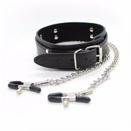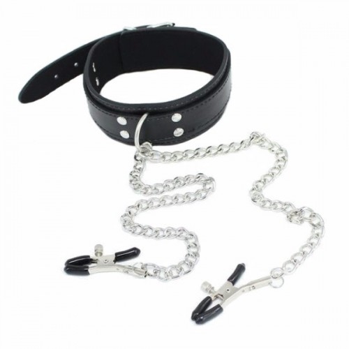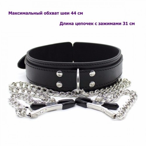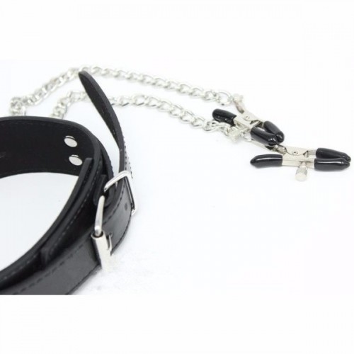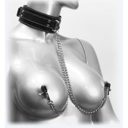 Чёрный ошейник выполнен из кожи и украшен заклепками. На двух цепях, отходящих от него, есть зажимы для сосков с резиновым покрытием и винтовой подкруткой.
