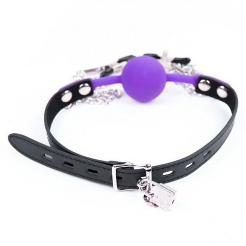 Кляп застёгивается и регулируется при помощи пряжки,так же в комплекте замочек и ключи.