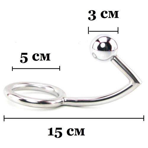 Этот девайс комбинирует в себе металлическое эрекционное кольцо, в которое следует продеть пенис и яички, и анальный крюк с шаром.
