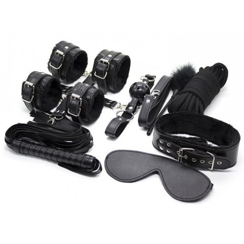 Комплектация: наручники, поножи, плеть, веревка, кляп, ошейник с поводком, маска для глаз, бондажный крест, тиклер.