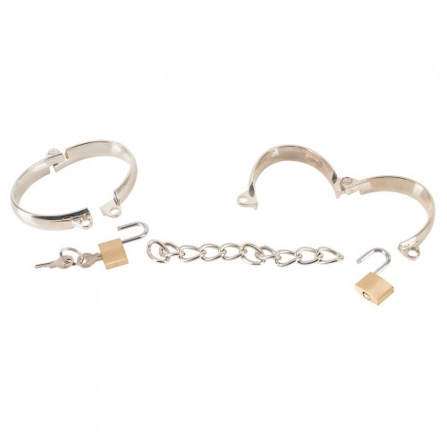 Красивые классические овальные оковы с цепочкой и двумя замками. Эти наручники отличаются тем, что застегиваются между собой на замок, если у Вас нет ключа, их не открыть.