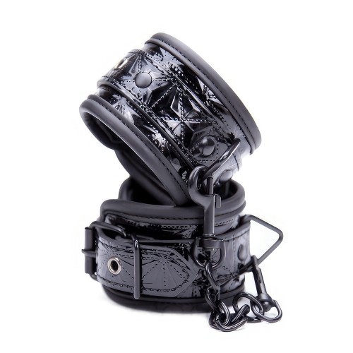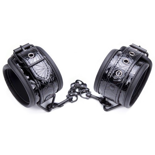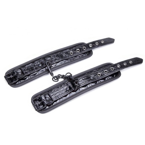 Наручники имеют универсальный размер, регулируемый ремешками с пряжками и соединяются металлической цепочкой с карабинами.