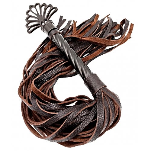 Плеть выполнена из натуральной кожи коричневого цвета. Витая рукоятка длиной 16см и диаметром 2см сделана из металла цвета шоколад, сверху декор в виде короны размером 9х8см. Хвосты длиной 40см, общая длина плети 60 см. Количество хвостов - 40 штук