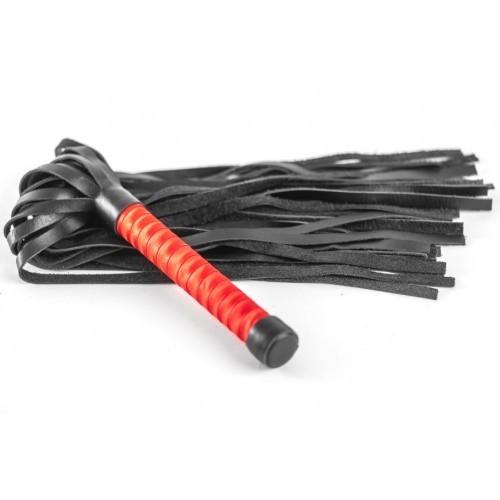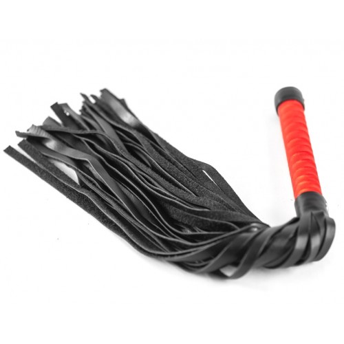 Ручка плети декорирована черной атласной лентой. Плеть имеет 34 мягких кожаных хвоста.