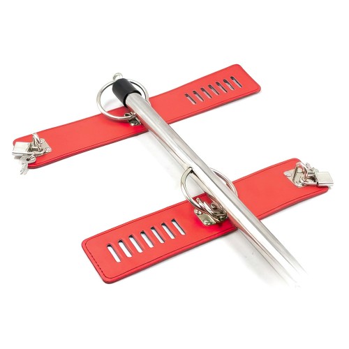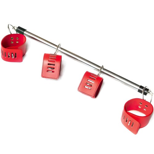 Красная бондажная распорка с наручниками и поножами