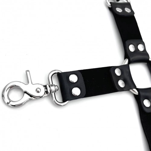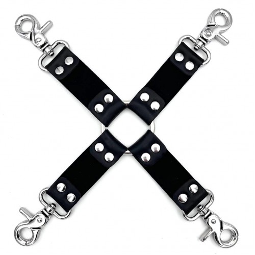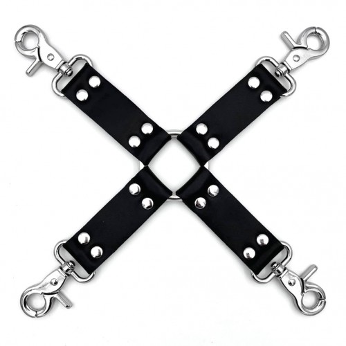 Изготовлена фиксация из кожи, она имеет четыре прочных крепления с карабинами, к которым Вы можете легко и быстро пристегнуть наручники и поножи.