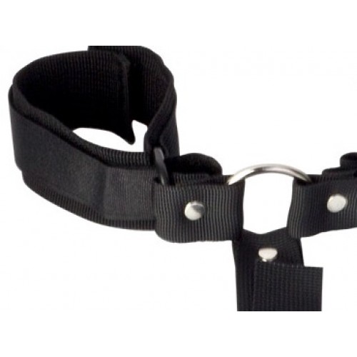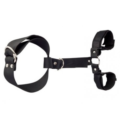 Бондажный ошейник соединён ремнём с фиксаторами для и рук и прекрасно подойдёт, как начинающим, так и опытным практикам субкультуры БДСМ.