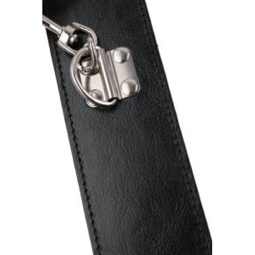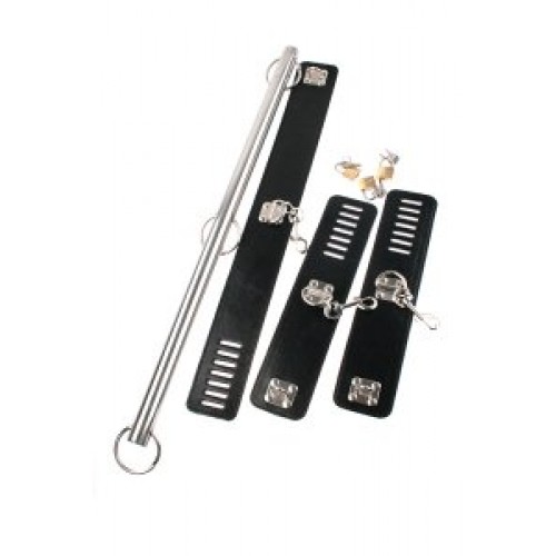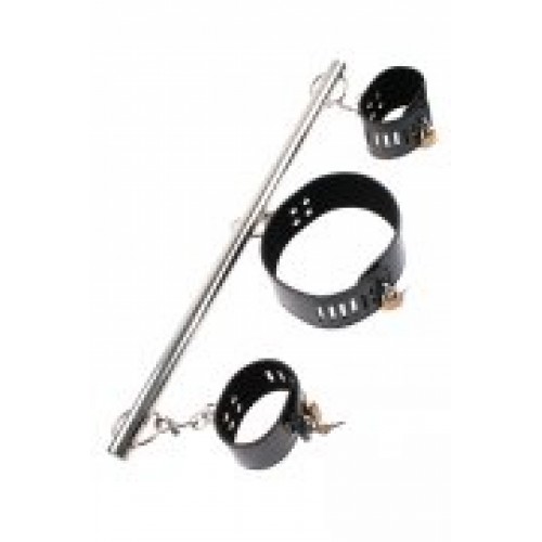 К стальной распорке, с помощью карабинов, прикреплены ошейник и наручники с регулируемым размером.