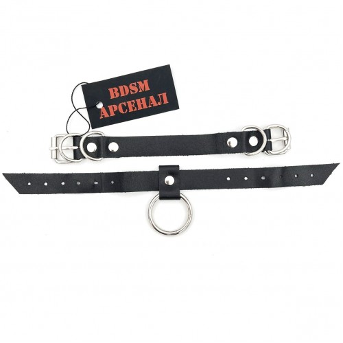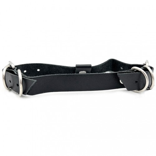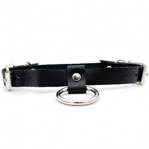 Оригинальный черный ошейник, декорированный четырьмя металлическими полукольцами и одним большим кольцом. Крепление в виде застежки.
