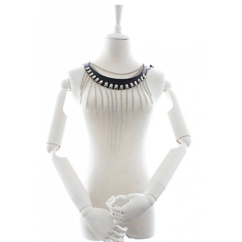 Ошейник украшен серебристыми металлическими цепочками.