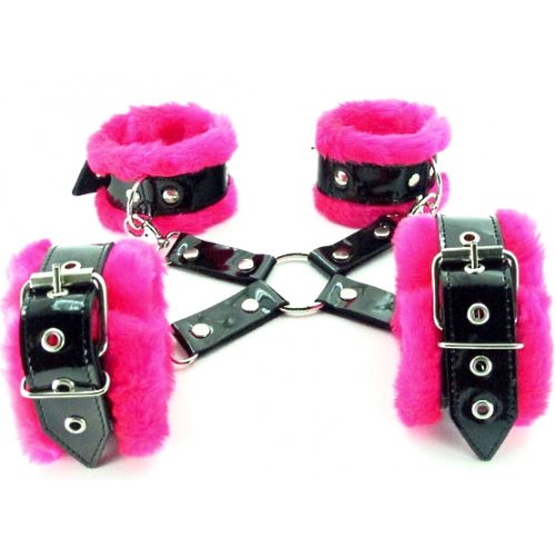 Оковы легко, но надежно фиксируются ремешками, позволяющими выбрать нужный размер. Соединяются между собой крепким бондажным крестом. Мягкий подклад из ярко-розового меха не будет натирать кожу, а также обеспечит комфортное пребывание в образе, помогая полностью погрузиться в БДСМ игру.