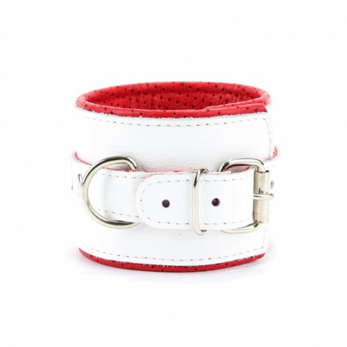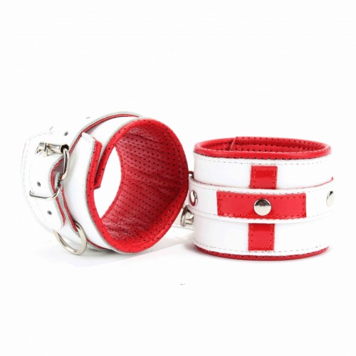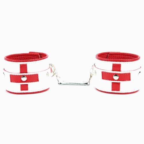 Оковы выполнены из натуральной кожи, декорированы для образа медсестры. Выполнены из белой гладкой кожи с ярко-красным лаковым крестиком, подклад из нежной красной кожи с перфорацией для максимально комфортного использования.Ширина оков 6см, ширина ремешков 2см. Подойдут на обхват от 17 до 28см. Металлическая пряжка надежно удерживает в подчинении, кожаное соединение с карабинами фиксирует оковы вместе, общая длина соединения 12см.