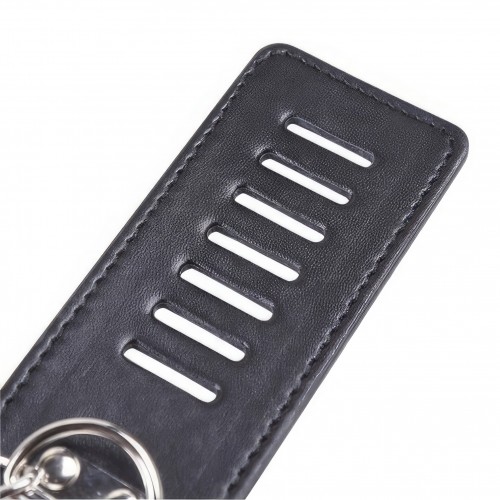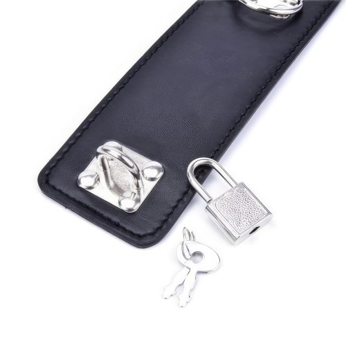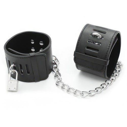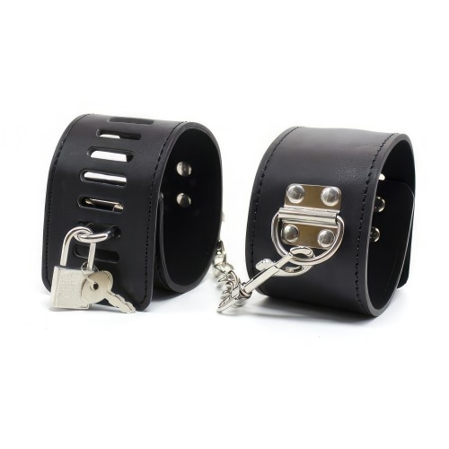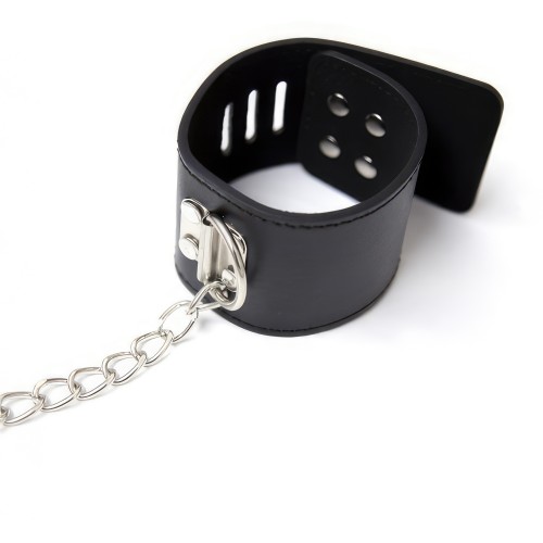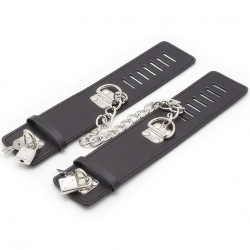 Наручники для БДСМ бондажа из искусственной кожи чёрного цвета имеют универсальный размер, который удобно регулируется при помощи застёжки на замке.