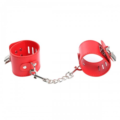 Наручники для БДСМ бондажа из искусственной кожи красного цвета имеют универсальный размер, который удобно регулируется при помощи застёжки на замке.