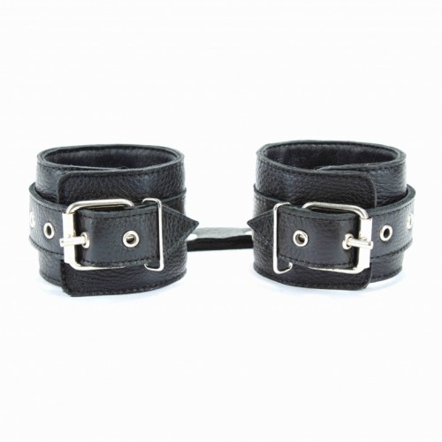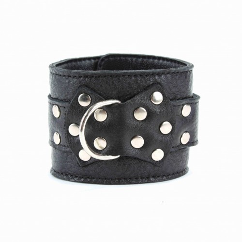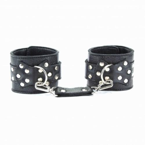 Наручники выполнены из натуральной кожи черного цвета. Декорированы заклепками и бантом с металлическим кольцом. Вся фурнитура металлическая. Наручники надежно фиксируются пряжками и ремнями, позволяющими выбрать нужный размер и отлично подойдут на обхват запястья от 18 до 25см. Нежный подклад из перчаточной кожи обеспечивает комфорт, кожаное соединение на карабинах фиксирует наручники вместе. Аксессуар позволяет в полной мере насладиться сексом в стиле БДСМ. Ширина наручников 6см, ширина ремешков 2,5см, общая длина соединения с карабинами 15см.