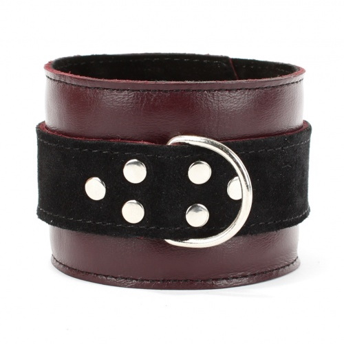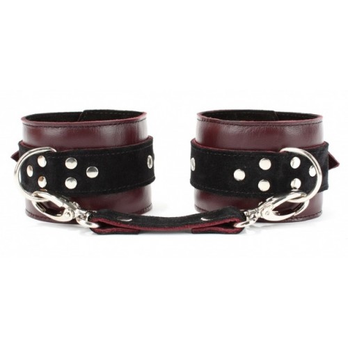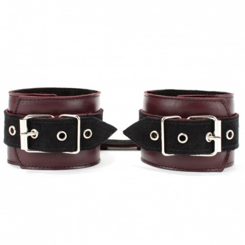 Наручники выполнены из натуральной кожи бордового цвета. Изделие декорировано ремнями из замши черного цвета. Посредине наручника расположено полукольцо из сварной фурнитуры.