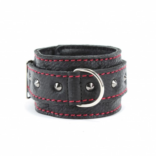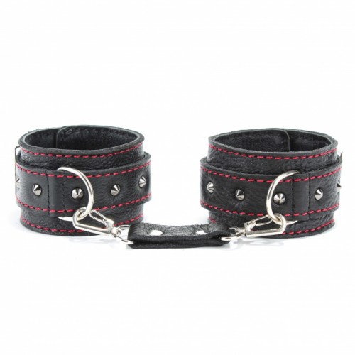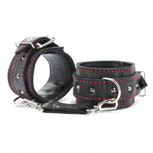 Наручники выполнены из черной натуральной кожи с красной контрастной строчкой, ширина наручников 5см. На ремнях украшение в виде металлических шипов, ширина ремешков 2,5см.