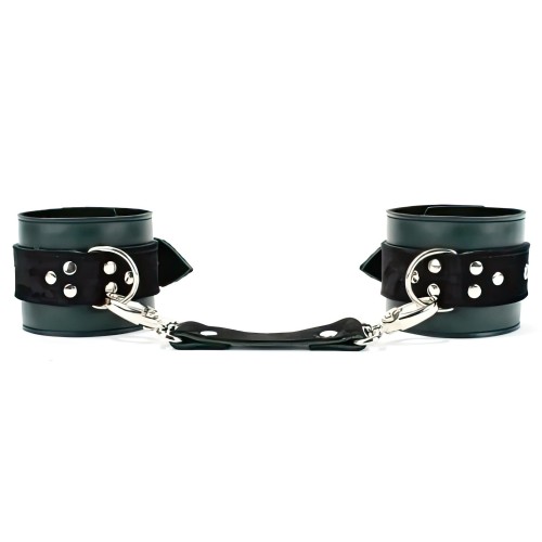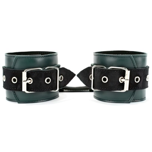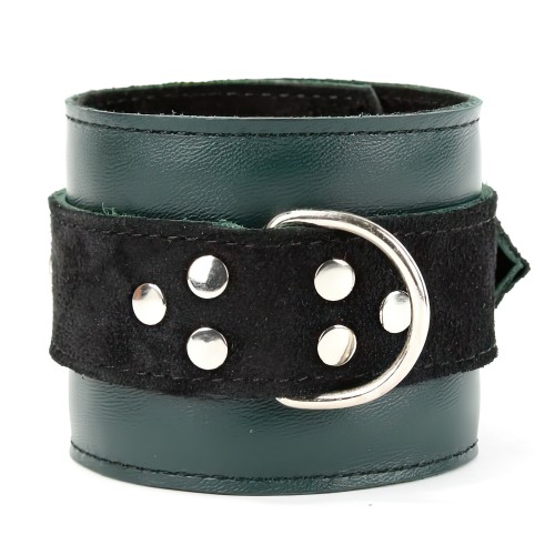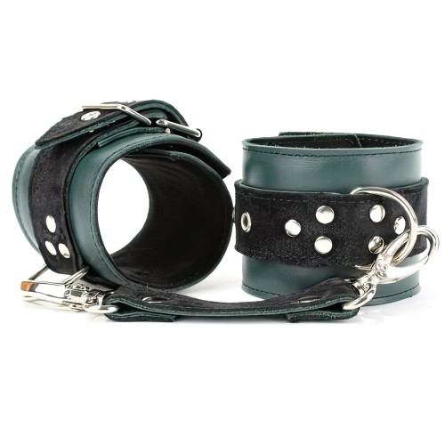 Оковы выполнены из натуральной кожи изумрудного цвета. Изделие декорировано ремнями из замши черного цвета. Посредине наручника расположено полукольцо из сварной фурнитуры.