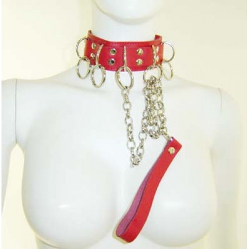 Бондажный ошейник выполнен из чёрной кожи на металлическом поводке-цепочке с кожанным темляком. Декорирован металлическими клёпками и 5 стальными кольцами, пикрепленных к D-образным кольцам, что позволяет пристегнуть поводок, наручники, поножи или любой другой фиксатор.