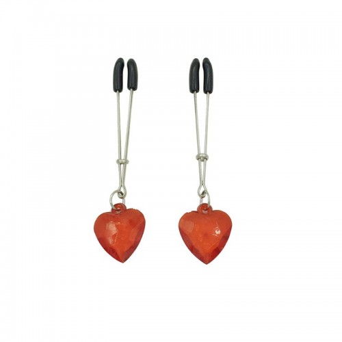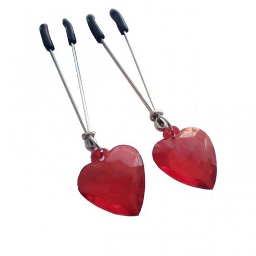 Металлические зажимы на соски украшены большими красными кристаллами в форме сердца. Зажимы имеют специальные мягкие наконечники, оберегающие нежную кожу сосков от повреждения. Сила сжатия регулируется специальным ползунком.
