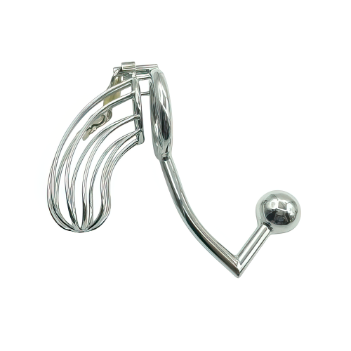 Размеры: длина корпуса по верхней дуге 14 см., длина корпуса по нижней дуге 8 см.,внутренняя длина корпуса 10 см., внутренний диаметр корпуса 4 см., внутренний диаметр запорного кольца 5 см., длина анального плага 5,5 см., диаметр шара 3 см.