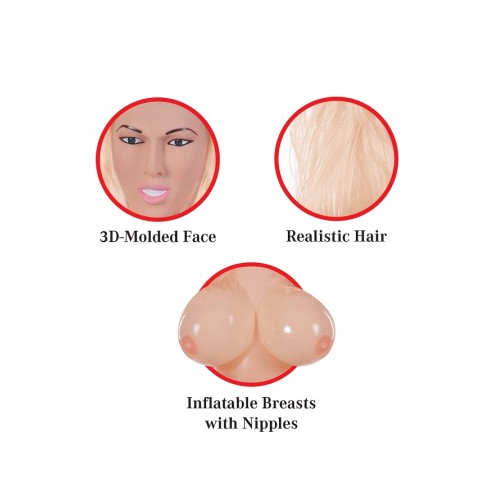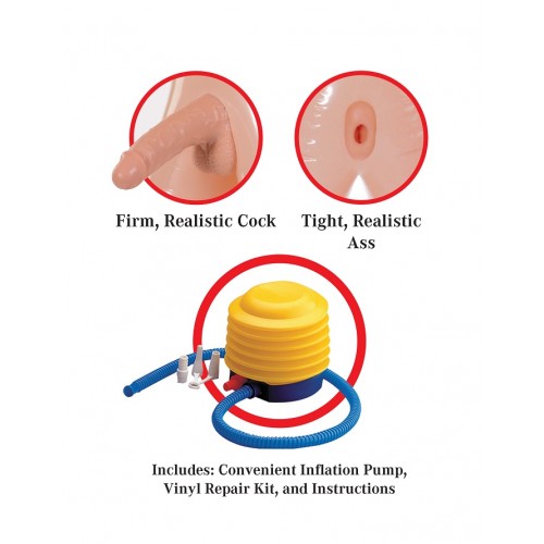 Комплектация: надувная кукла, двухсторонняя вставка фаллоимитатор и анус, ручной насос, ремкомплект